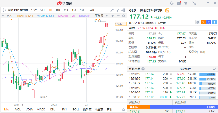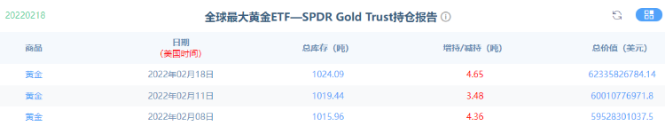 GLD为道富环球旗下SPDR系列ETF的基金之一,以黄金价格为基础,是一只由实物资产支持的在美上市ETF,截至2月18日,ETF当前总规模超过623亿美元。