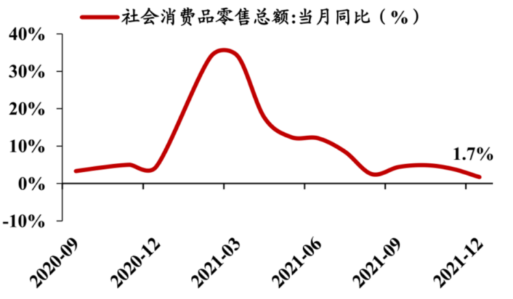 站在当前时点来看,首先要面对的就是消费持续走弱和出口承压。2021年12月单月社零同比增长为1.7%,相对与前值3.9%的增长而言,出现明显下滑。