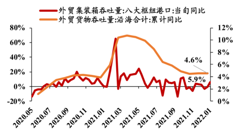 而出口方面,12月八大枢纽港外贸箱吞吐量仅同比增加1.1%,可能是因为PPI因素导致涨价,才使得12月进出口总额同比增长20.5%,但吞吐量增长放缓已经基本确定。考虑到海外发展中经济体供给修复,以及发达经济体耐用品消费景气度走弱,22年出口将面临不小压力。