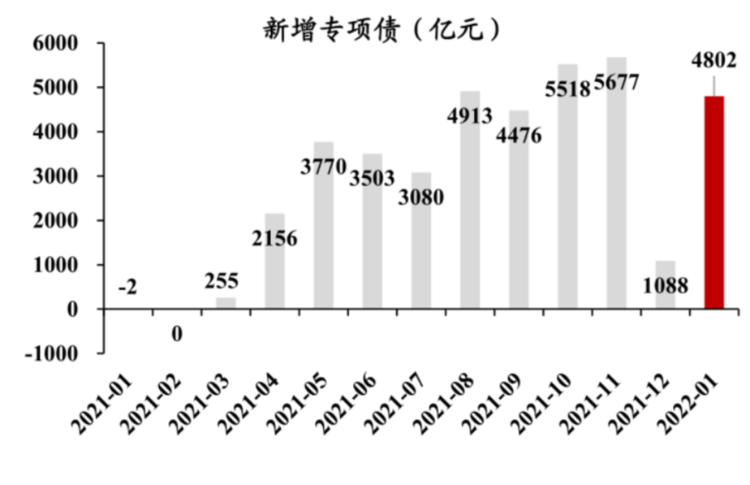 同时,财政部也已提前下达了22年专项债限额1.46万亿元,有望于22Q1发行结束。根据央视网统计,截至1月24日,一季度计划发行地方债约1.51万亿元。从22年已发行情况看,1月新增专项债超4800亿元,占提前下达额度33%,发行明显提速。