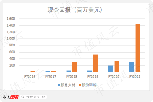 公司其实是选择了回购,也就是刚性较低、更加灵活的回报方式:2018~2021财年公司总共花费了26亿美元回购自家股份,尤以2021财年为甚,达到14亿美元。而2017年及以前仅约2000万美元。