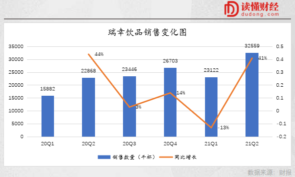 持续出爆款能力,也使得瑞幸的销售量持续增长。半年报显示,2021年上半年瑞幸销售了3.25亿杯,相较于2020年同期的2.28亿杯,同比增长41%。销量的大增也直接带动了瑞幸业绩增长,瑞幸的净营收从2020上半年的15.44亿元增加到31.82亿元,同比增长106%。