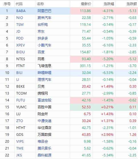 华盛资讯2月22日消息,热门中概股普跌,流利说 $LAIX 、雾芯科技 $RLX 跌超10%,哔哩哔哩 $BILI 、小鹏汽车 $XPEV 跌超6%,网易 $NTES 跌超5%,阿里巴巴 $BABA 跌超4%,蔚来汽车 $NIO 、携程 $TCOM 跌超2%。