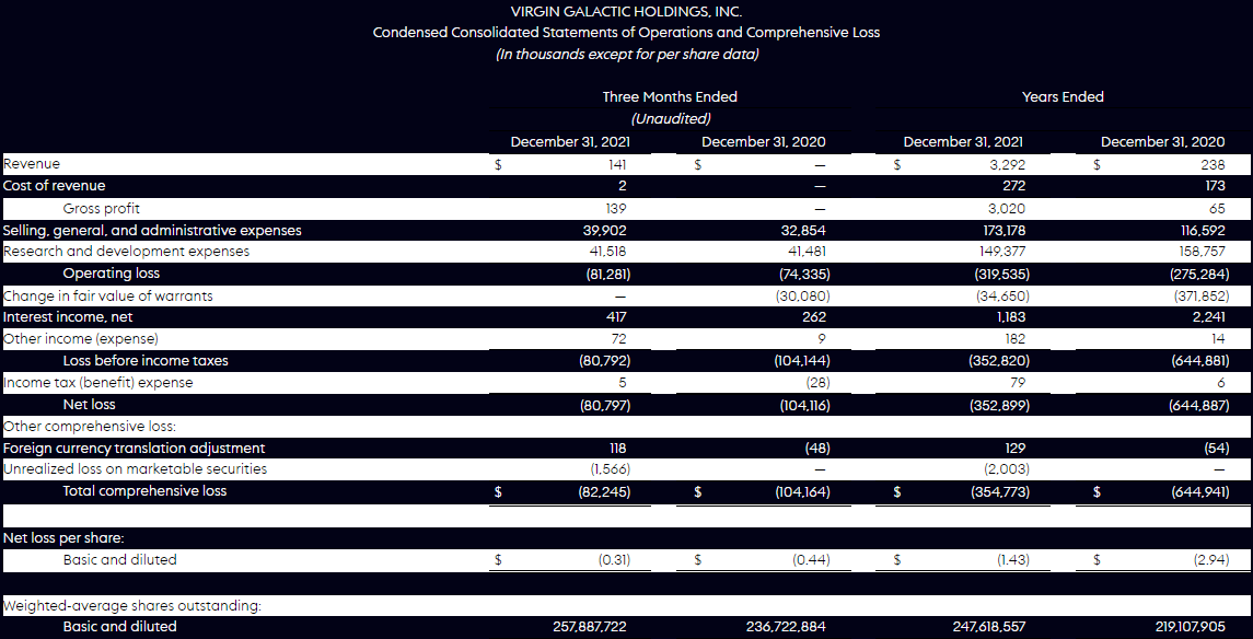 维珍银河2021年营收329.2万美元,去年同期为23.8万美元;净亏损3.53亿美元,去年同期净亏损为6.45亿美元;摊薄后每股亏损为1..43美元,去年同期每股亏损为2.94美元。