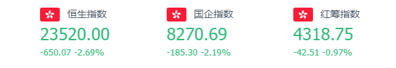 截至周二收盘,恒指跌2.69%,报23520点,国企指数跌2.19%,红筹指数跌0.97%。恒生科技指数一度重挫3%,收跌1.89%,快手涨2.75%,联想集团翻红,腾讯跌0.13%,哔哩哔哩、网易、美团等跌幅收窄。