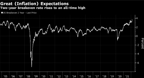 债券投资者对美国通胀的短期预期跃升至纪录高位,石油,天然气和煤炭价格飙涨加剧了对通胀压力进一步上升的担忧,两年期盈亏平衡通胀率达到历史最高水平。