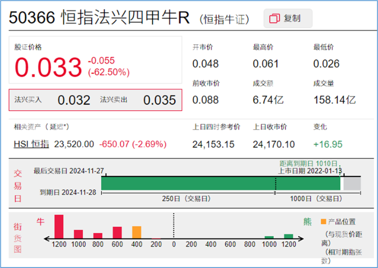 2、看错方向:恒指法兴四甲牛(50366.HK),周二下跌62.5%。