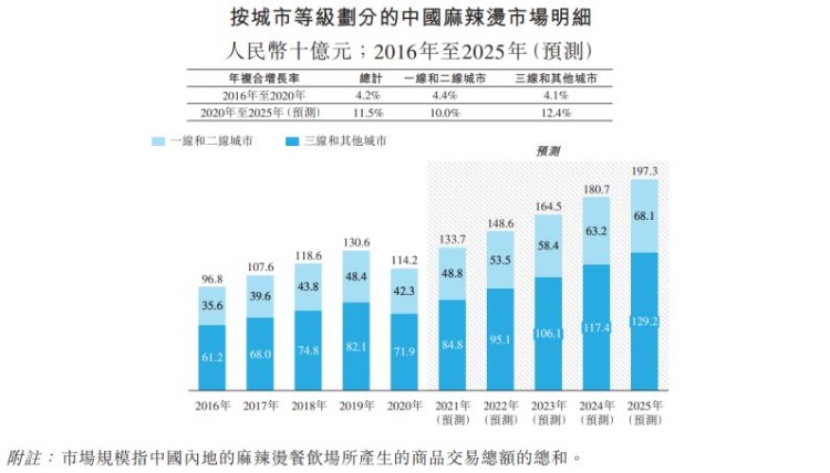 麻辣烫市场正发展成为中国快餐市场的重要分部,按商品交易总额之和计算,中国麻辣烫市场由2016年的约人民币968亿元增加至2019年的约人民币1306亿元,年复合增长率约为10.5%;预计2025年中国麻辣烫市场将达到1973亿元,5年复合增长率为12.4%。