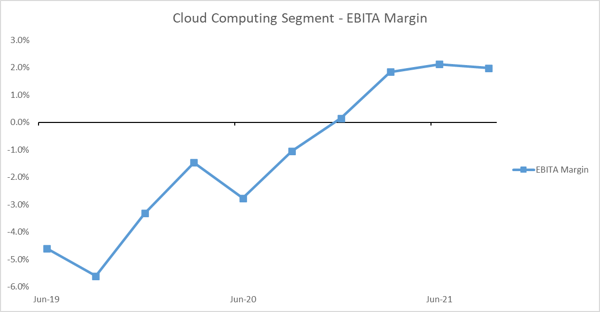 虽然阿里云仅产生约2%的EBITA利润率,远低于阿里巴巴的核心业务,但趋势明显指向利润率上升。云计算是利润的贡献者,随着业务的成熟,其利润率会持续上升。
