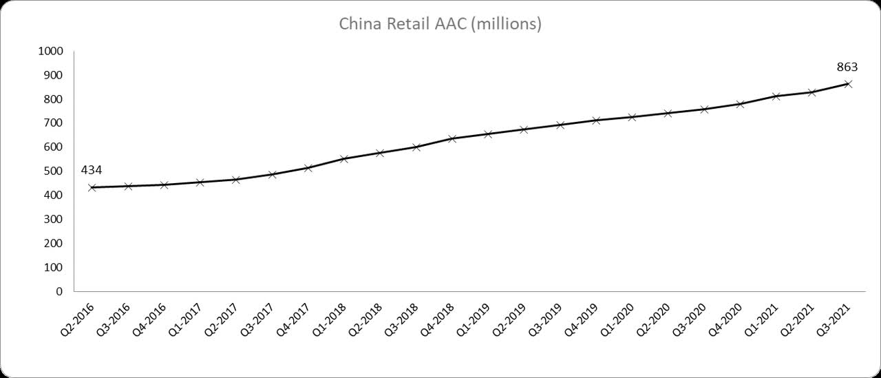 此外,另一个关键风险则是监管风险。很难确切知道未来是否存在进一步的监管风险。不过,阿里巴巴此前承诺投入1000亿元人民币(约155亿美元)落实十项具体行动,助力推动共同富裕。这项投资对阿里巴巴是正向的,因为它将用于扩大中国农村地区的互联网接入,反过来也会扩大阿里巴巴的总体潜在市场和年度活跃用户。