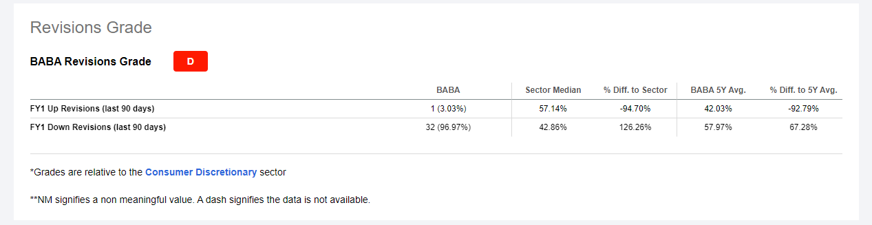 据悉,SeekingAlpha给出的阿里巴巴(BABA.N)盈利修正评级为D,这可不是什么好事。