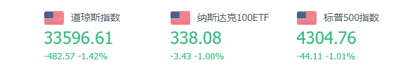 昨日,由于地缘局势引发的担忧情绪,美股主要指数均跌超1%。截至2月22日周二收盘,道指收跌482.57点,跌幅为1.42%,报33596.61点;纳指收跌166.55点,跌幅为1.23%,报13381.52点;标普500指数收跌44.11点,跌幅为1.01%,报4304.76点。 其中,标普500指数时隔两年再次进入技术性回调。