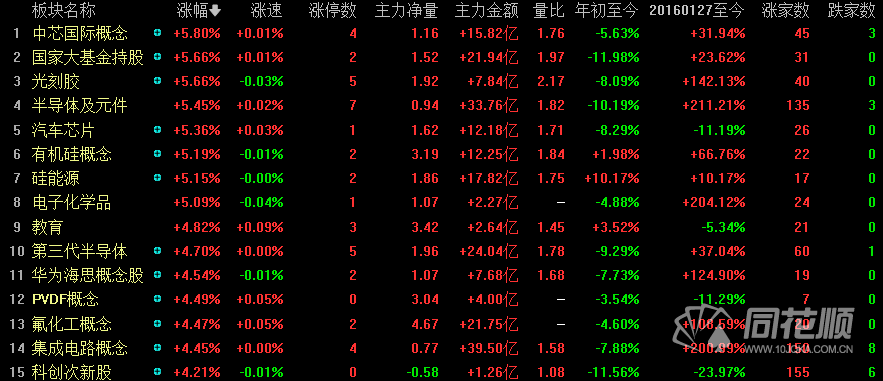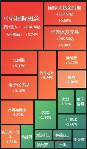 2月23日半导体板块集体上涨,截至收盘,中芯国际概念、国家大基金持股、半导体及元件、光刻胶、汽车芯片等一众半导体相关概念板块涨幅居前。