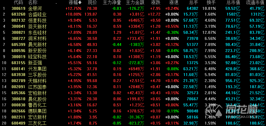 2月23日,有机硅板块表现较好,板块中个股多数飘红,金银河(300619)涨幅超过12%,龙头合盛硅、恒星科技涨停,东岳硅材、润和材料、回天新材等跟涨。