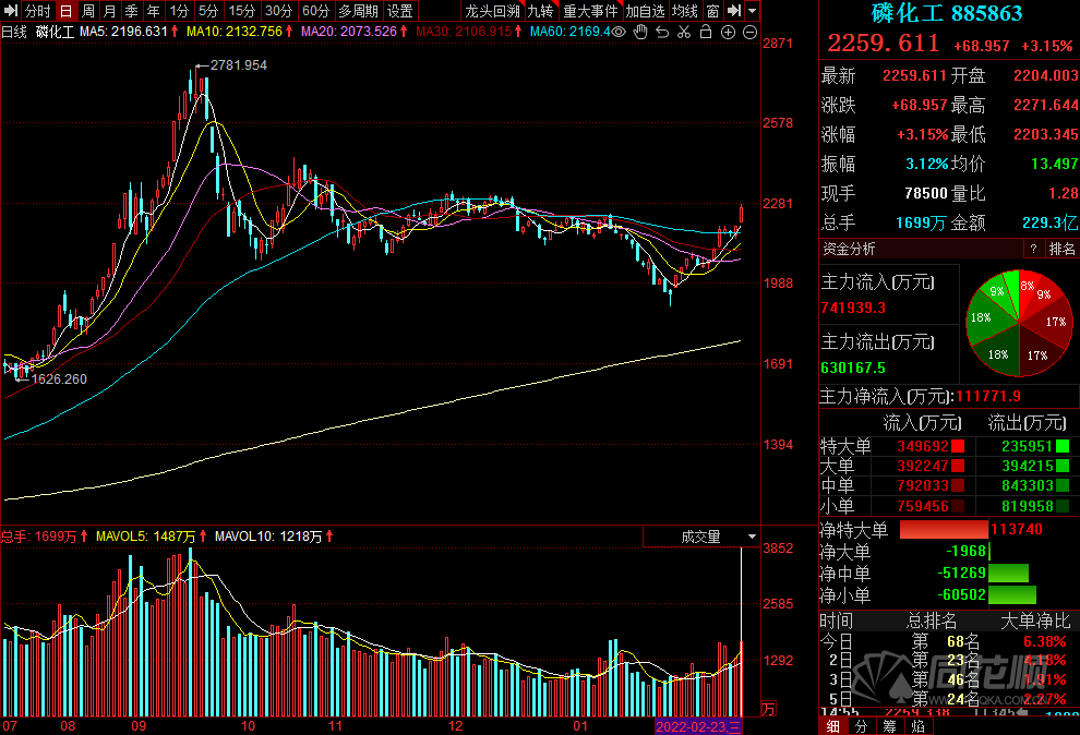 今日,磷化工板块上涨3.15%,云天化(600096)涨停,湖北宜化(000422)、兴发集团(600141)等涨幅均超5%。