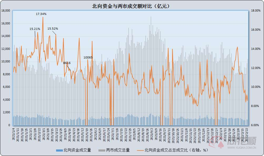 成交量方面,两市合计成交金额10409亿元,成交额重回万亿水平。北向资金成交量为894.47亿元,占比A股总成交量的比重为8.59%。