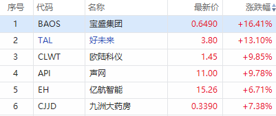 华盛资讯2月23日消息,美股盘初,宝盛集团 $BAOS 涨超16%,好未来 $TAL 涨超13%,声网 $API 涨超9%,亿航智能 $EH 涨超6%。