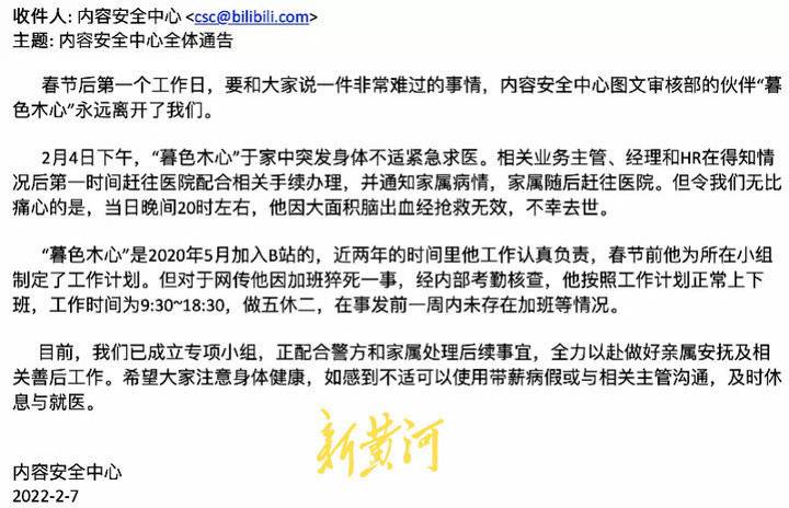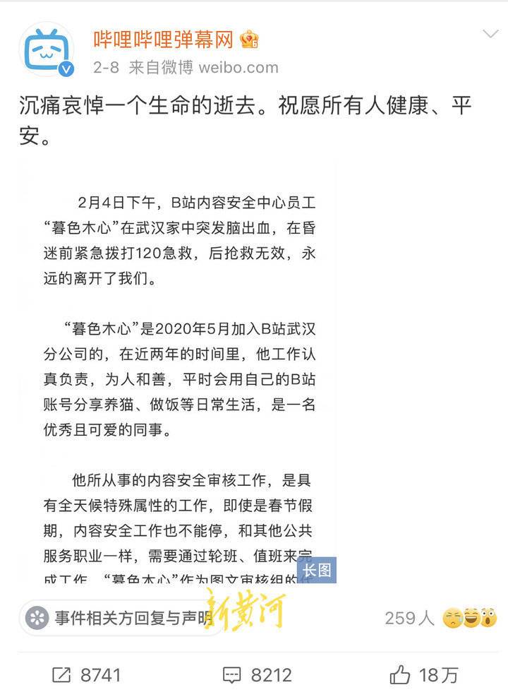 大年初四,B站武汉分公司员工“暮色木心”在武汉家中突发脑出血,在昏迷前紧急拨打120急救,后抢救无效死亡。B站在通报中表示,猝死员工“暮色木心”是图文审核部员工。春节期间,他没有回乡过年,带领小组安排了一天八小时、做五休二的春节轮值排班计划。