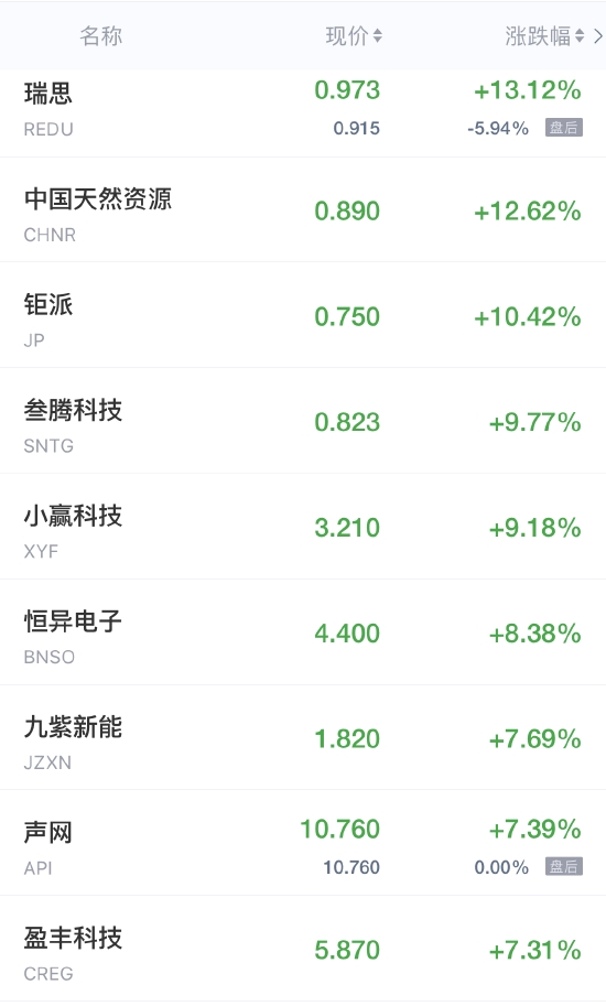 瑞思涨超13%,好未来、小赢科技涨超9%,九紫新能、声网涨超7%,人人公司、掌门教育涨超5%,搜狐涨超3%,前程无忧涨近2%,虎牙、36氪、汽车之家、瑞幸粉单涨超1%,雾芯科技涨1%。