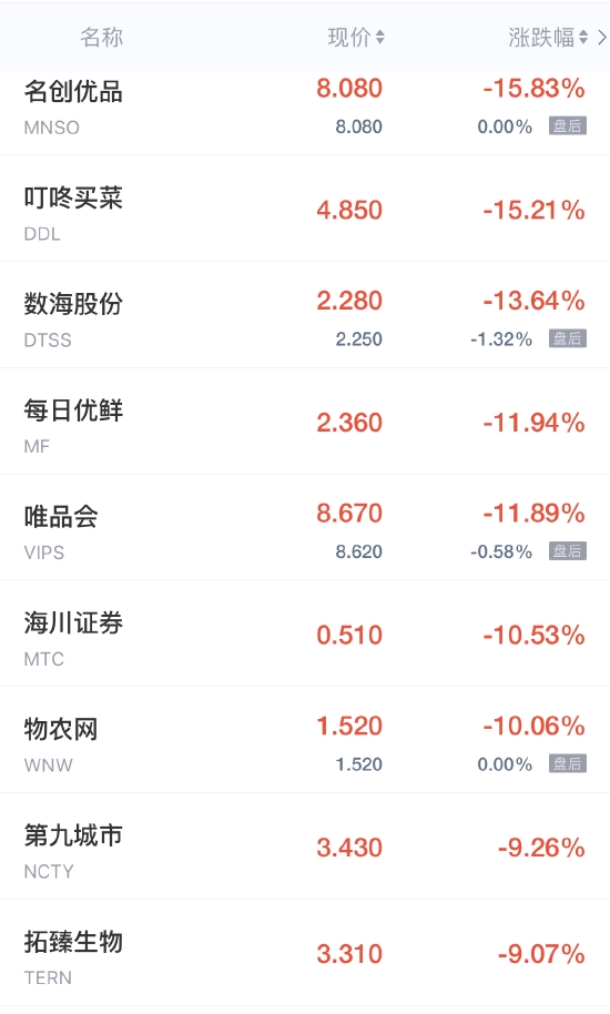热门中概股周三收盘多数下滑,名创优品、叮咚买菜、唯品会等跌幅居前。