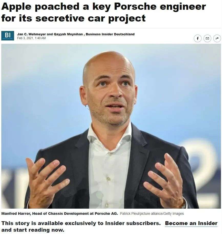 人才方面,在苹果汽车项目初期,大约有 1000 名专家和工程师参与其中,后来扩大到 5000 人。为此,苹果先后从各路大厂挖来多名专家高管,包括黑莓 QNX 系统联合创始人 Dan Dodge、保时捷底盘副总裁 Manfred Harrer 等,并斥资收购自动驾驶汽车创业公司 Drive.ai。