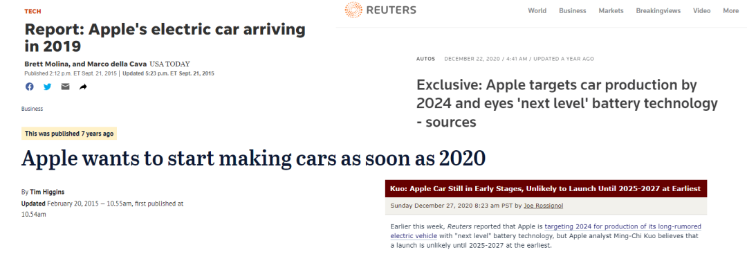 虽然苹果对造车一事保持缄默,但天大的消息,总是藏不住的。正如特斯拉 CEO 马斯克所说:“如果你雇佣超过 1000 名工程师来做一件事情,是很难藏得住的。”在各大新闻媒体上,苹果造车计划的传闻从未消停,发布时间也是五花八门:有说 2019 年,有说 2020 年,后来又说 2024 年,地表最强苹果分析师郭明錤也没个准,认为要到 2025 到 2027 年间甚至更晚……