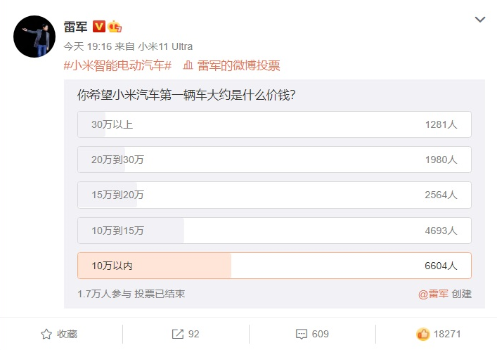 高调宣布造车以来,小米也没闲着,雷军先后到访长安、上汽、东风、广汽、上汽通用五菱、长城等多家车企,还与网友讨论造什么车型、定价如何等。不出意外,最受欢迎的选项,肯定是最便宜的那个。不过雷军表示,小米第一台车“不是轿车就是 SUV,售价区间在 10-30 万元。”