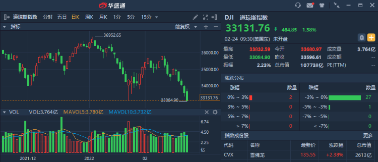 美股昨日继续下跌,道指 $DJI 收跌1.38%于33131.76点,即将进入回调区间。此前标普500 $SPX 、纳指 $IXIC 已分别于周二和今年1月陷入回调区间。消息方面,今日乌克兰全境已进入战时状态。俄罗斯国防部此前表示,乌克兰武装部队空军的军事基础设施已瘫痪,乌克兰武装部队的防空力量已被完全压制。