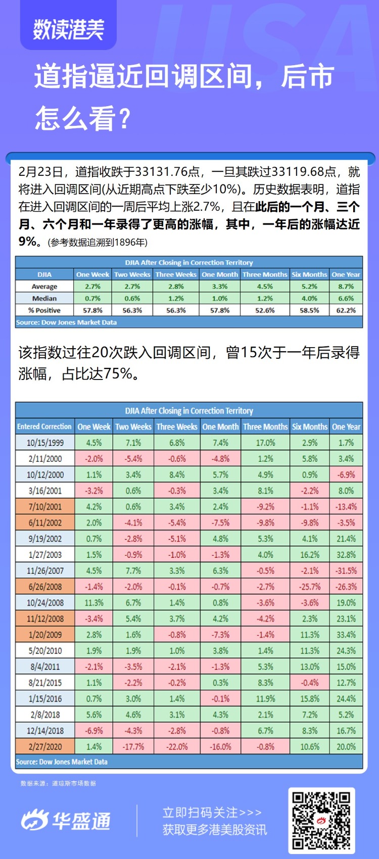 据道琼斯市场数据,平均而言,道指在进入回调区间的一周或两周后上涨了2.7%,且在此后的一个月、三个月、六个月和一年录得了更高的涨幅,其中,一年后的涨幅达近9%。(参考数据追溯到1896年)