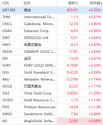 黄金股、石油概念股走强,赫克拉矿业、金罗斯黄金、金田、哈莫尼黄金、巴里克黄金等黄金股普遍上涨。