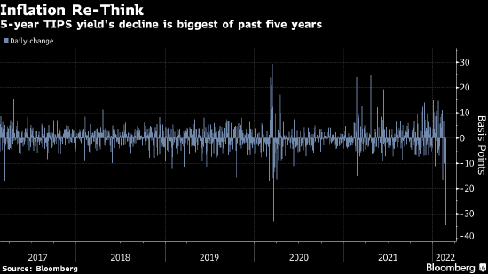 俄乌开战导致关键大宗商品价格飙升,美国、英国、欧洲的短期通胀预期指标达到纪录高位。10年期英国国债实际收益率料将创下2016年英国脱欧公投后的最大跌幅,德国国债收益率也将迈向至少2009年以来最大跌幅。美国5年期实际收益率下挫逾30个基点,超过了2020年疫情高峰时的跌势 。