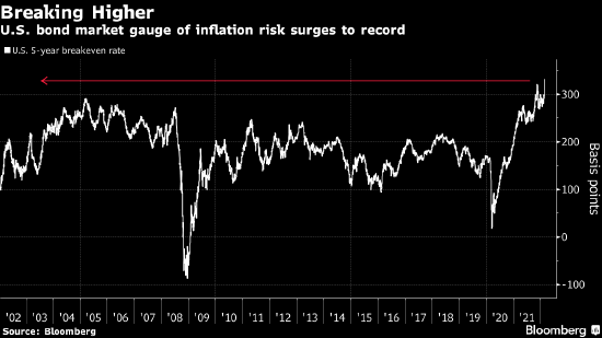 英国10年期盈亏平衡通胀率升至逾25年最高水平,德国10年期盈亏平衡通胀率自2011年以来首次升破2%。美国5年期收益率跃升至3.33%的历史高位。