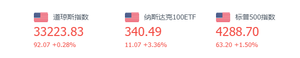 美股周四逆转收高,科技股领涨。道指涨92.07点,涨幅为0.28%,报33223.83点;纳指涨436.10点,涨幅为3.34%,报13473.59点;标普500指数涨63.20点,涨幅为1.50%,报4288.70点。