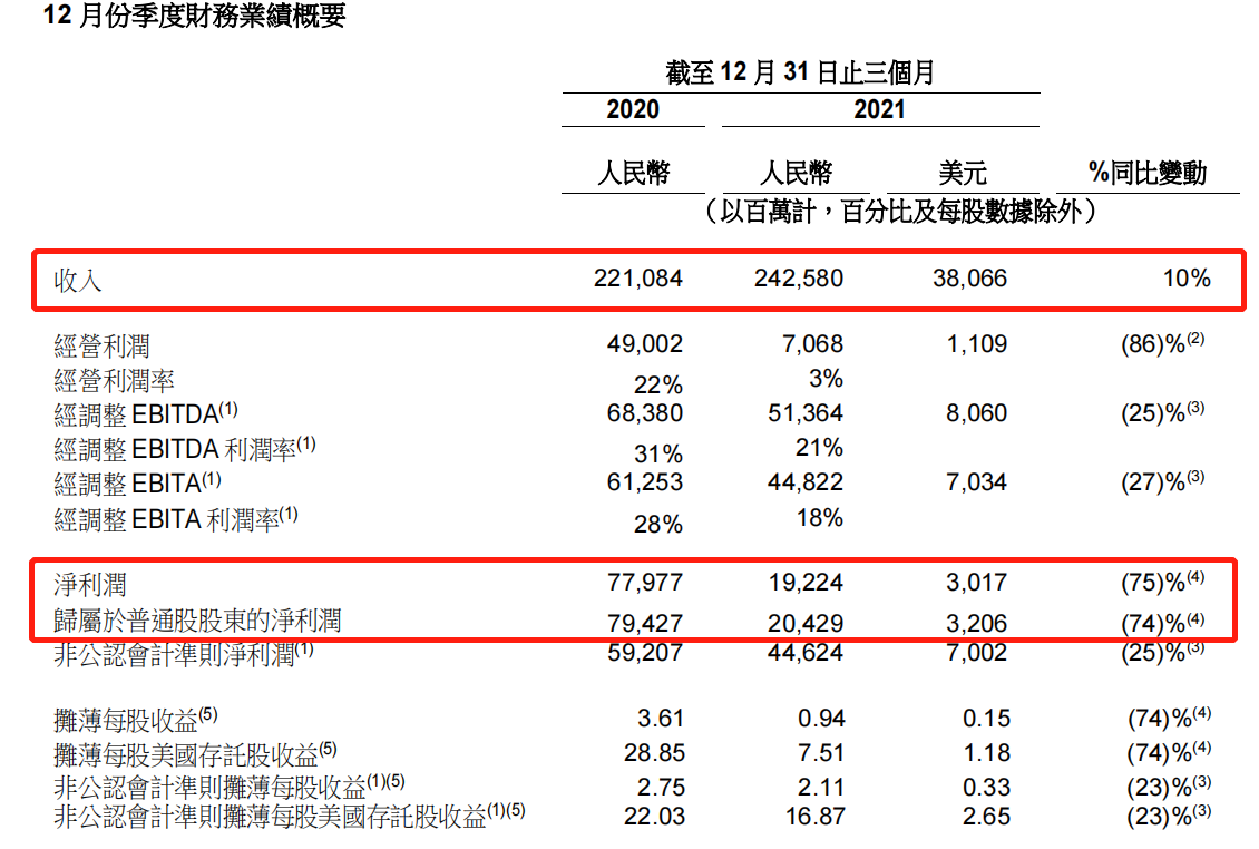 阿里巴巴Q3营收同比增长10%,达2425.8亿元,低于市场预期的2463.7亿元人民币。归属于普通股股东的净利润为204.29亿元及净利润为192.24亿元,分别同比下降74%及75%。