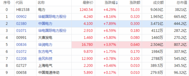 华盛资讯2月25日消息,港股电力股午后走强。截至发稿,华能国际电力涨超8%,报4.24港元每股;中国电力涨7.89%,现报4.1港元每股,成交额3.471亿港元;华电国际电力涨6.59%,大唐发电涨超5%;华润电力、东方电气、上海电气跟涨。