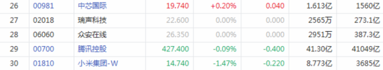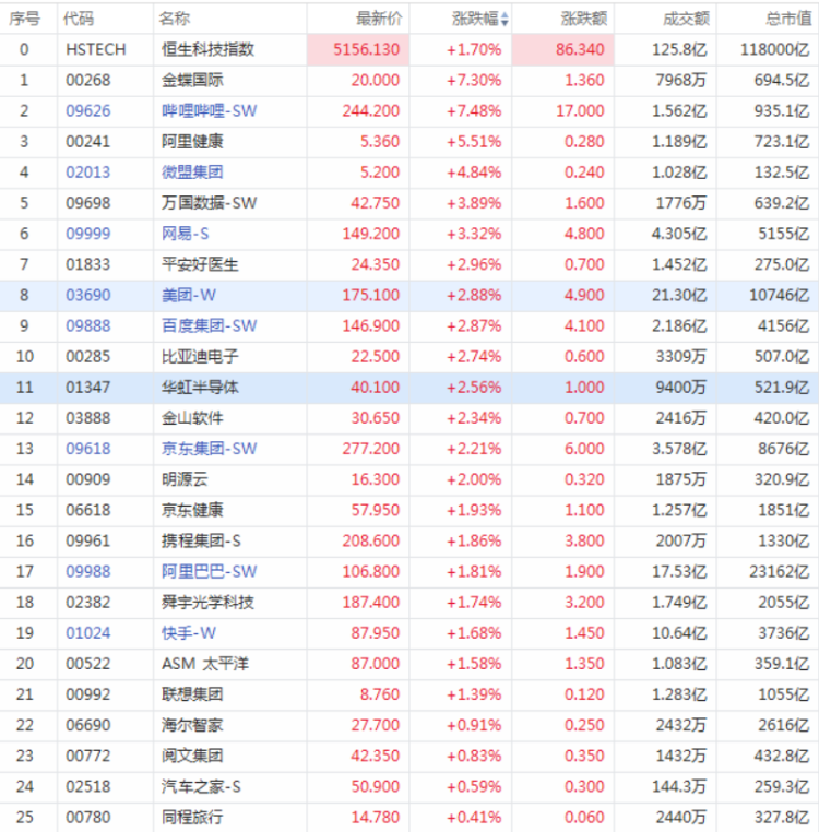 科网股方面,B站反弹7.48%,现报244.2港元每股,成交额1.56亿港元;网易绩后涨3.32%,百度涨2.87%,美团、京东涨逾1%,阿里微涨1.81%;腾讯、小米微跌。