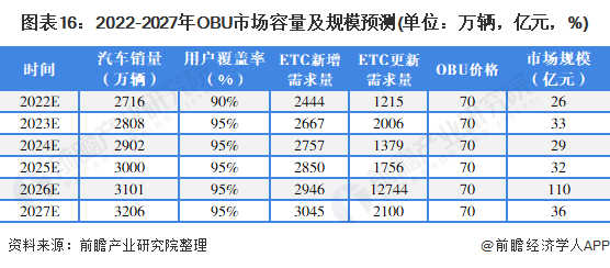 OBU的设计使用寿命为5-8年左右,更新换代时间较短,假设每7年完成一次彻底的更新换代;同时假设2021-2022年ETC覆盖率达到90%,2023-2025年进一步上升至95%,估算2022年开始OBU价格稳定在70元/套,由此预计2027年OBU市场需求规模将在36亿元左右。