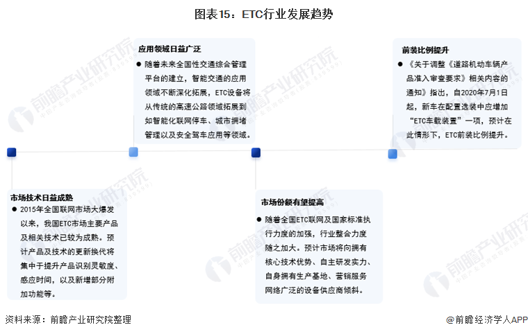技术方面,我国高速公路ETC市场自2015年全国联网市场大爆发以来,主要产品及相关技术已较为成熟。产品及技术的更新换代将集中于提升产品的识别灵敏度、感应时间的提升,以及新增部分附加功能等。