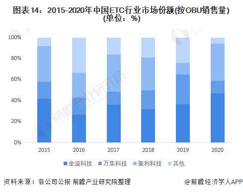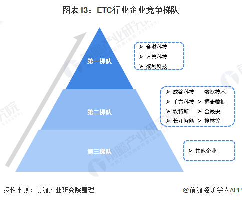 目前,中国ETC行业企业中,金溢科技、万集科技、聚利科技(华铭智能子公司)在车载ETC产品方面的销售量最高,同时位列ETC品牌榜前三,属于行业第一梯队;成谷科技、千方科技、埃特斯、长江智能数据技术、握奇数据等位列品牌榜前十,属于行业第二梯队;其他企业属于行业第三梯队。