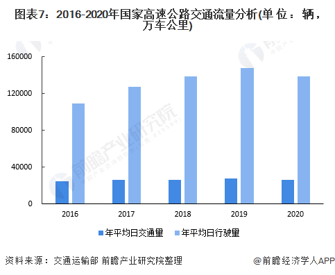 2016-2019年,我国高速公路年平均日交通量和日均行驶量均不断增加。2019年国家高速公路年平均日交通量为27936辆,增长4.1%,年平均日行驶量为147826万车公里,增长3.4%。受疫情影响,2020年,国家高速公路年平均日交通量为26435辆,增长5.4%,年平均日行驶量为138840万车公里,增长6.0%。