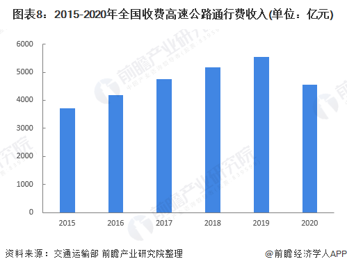 2015-2019年,高速公路流量不断增长的同时,全国通行费也随之上升。受到两次延长春节假期小型客车免费通行政策影响,2020年度,全国收费公路车辆通行费总收入4868.2亿元,比2019年净减1069.7亿元。