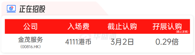 金茂物业为中国金茂 $00817.HK 旗下物管服务商,入场费4111港币,截止发稿孖展认购0.29倍,将于下周三截止认购。