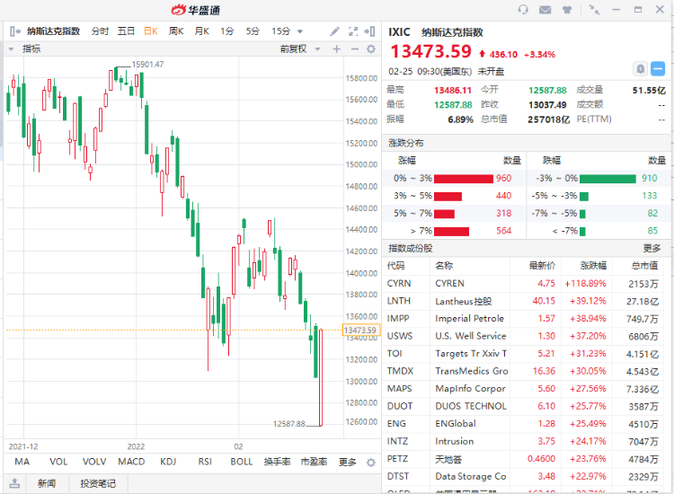 俄乌冲突所引发的“冲击波”在全球金融市场上蔓延,不过美国市场上呈现的情况比较复杂,因为很多公司没有受到这场冲突的直接影响。美股昨日起初下跌而后强力拉升,周四纳斯达克指数 $IXIC 收涨超3%。