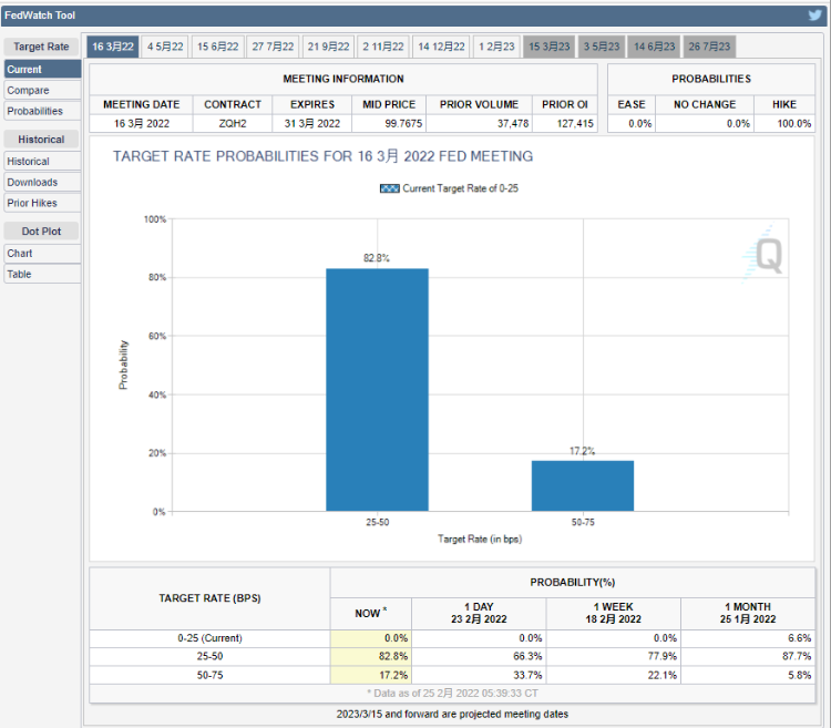 美联储政策预期方面,根据CME美联储观察数据,由于俄罗斯对乌克兰的攻击所造成的经济不确定性,美联储3月份将加息50个基点的可能性已经降低;最新数据显示,美联储在3月份加息25个基点的概率为82.8%、加息50个基点的概率为17.2%。