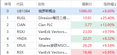 美股俄罗斯概念股盘初走强,二倍做多俄罗斯ETF $RUSL 涨超25%,Cian PLC $CIAN 涨14%,iShares安硕MSCI俄罗斯ETF $ERUS 涨超9%,Yandex $YNDX 涨超8%。