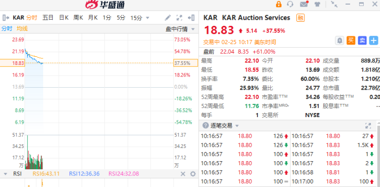 华盛资讯2月25日消息,KAR车行 $KAR 盘初暴涨逾37%,此前KAR Global以22亿美元向Carvana出售其在美国的车辆拍卖业务。