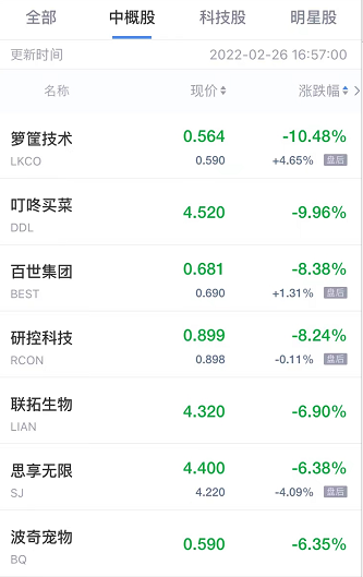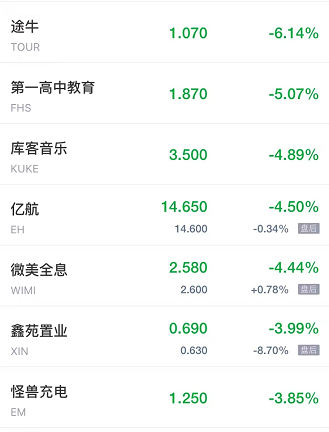 箩筐技术跌超10%,叮咚买菜跌近10%,百世集团跌超8%,怪兽充电、途牛跌超6%,第一高中教育跌超5%,库客音乐跌超4%,高途、乐居、满帮跌超3%,