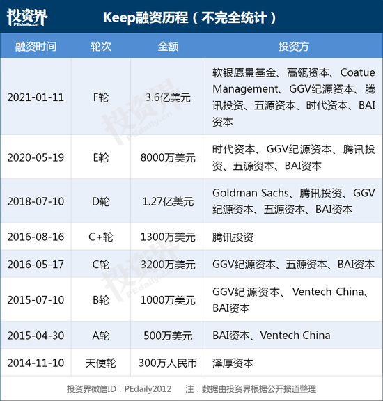 8年时间,Keep从当年一行代码长成中国最大的线上健身平台,坐拥3亿用户,一年进账超11亿元。它的身后也集结了一支豪华投资人队伍,BAI资本、GGV纪源资本、五源资本、腾讯投资、时代资本、软银、高瓴、Coatue等十余家VC/PE为其注入近40亿。2021年,Keep完成新一轮融资后估值达20亿美元(约合人民币126亿元)。