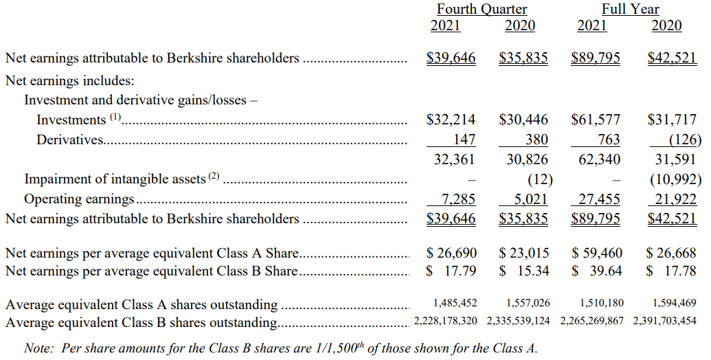 伯克希尔公布了2021年Q4及全年财报,其中:
