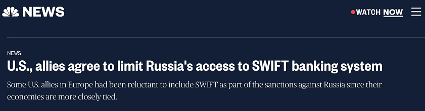【环球网报道】美国全国广播公司(NBC)消息,美国、欧盟委员会、法国、德国、意大利、英国、加拿大的领导人在一份联合声明中称,“我们保证将被选中的俄罗斯银行从SWIFT(环球同业银行金融电讯协会)国际结算系统中排除。这一举措将确保这些银行与国际金融体系脱节,并损害它们在国际上经营的能力。”